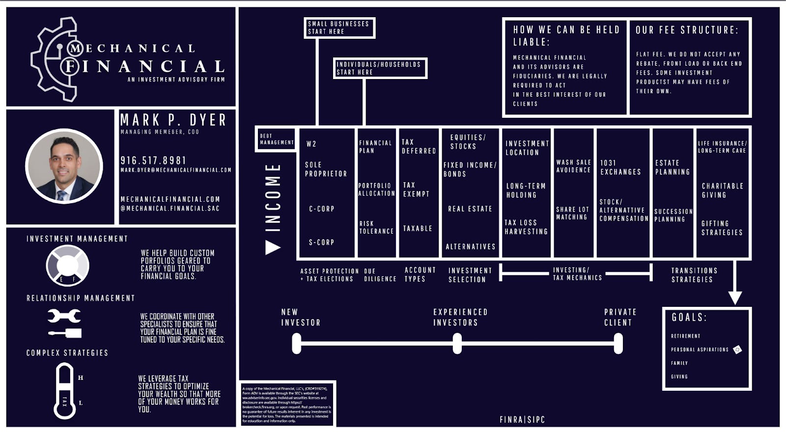 Diversification happens at various stages of the wealth management process. Referring back to MechFi’s individual/small business owner's service blueprint, diversification exhibits its most promising properties in potential return opportunities, mitigating the risk of anyone's investment and lowering tax bills.