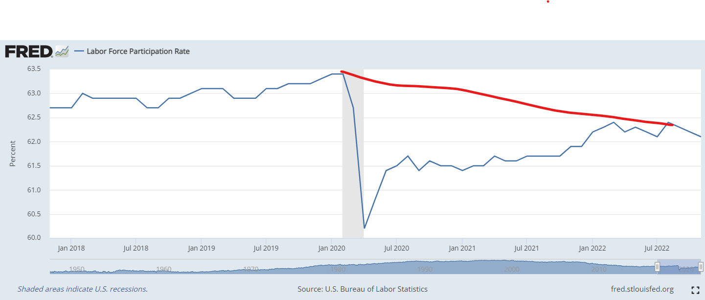 Economics: Unfortunately, like every news station reports, the more bad news we see about the economy is good. People want lower prices. However, getting there requires increasing unemployment and lowering consumption. Both mean real families out of work. However, in this case, because of the economy's capacity, real people are out of their homes too. That's true in the sense that per person working, they are supporting fewer people than before. I don't have this figure, but when it goes down, it’s like gain green, a form of deterioration that can’t be undone. Here is the employment participation rate; it went down a lot. The concern is if it never recovers.