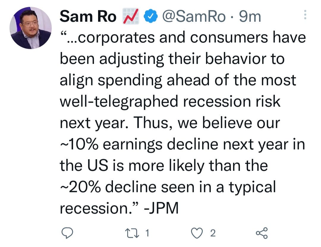 Economics: I read an interesting tweet shared by Sam Ro, CEO/Founder of TKer LLC. A similar but far more robust newsletter shares perspectives on key charts that are often never discussed. The tweet below highlights a loose quote by the JPM investment team simply stating that because of the rhetoric about inflation, people are adjusting their spending. They are being forward-looking and mindful about their spending and amortizing it over a longer time horizon, and therefore a less robust tail-end of ‘23, with a less steep decline at the front of the year. In technical terms, less seasonality.
